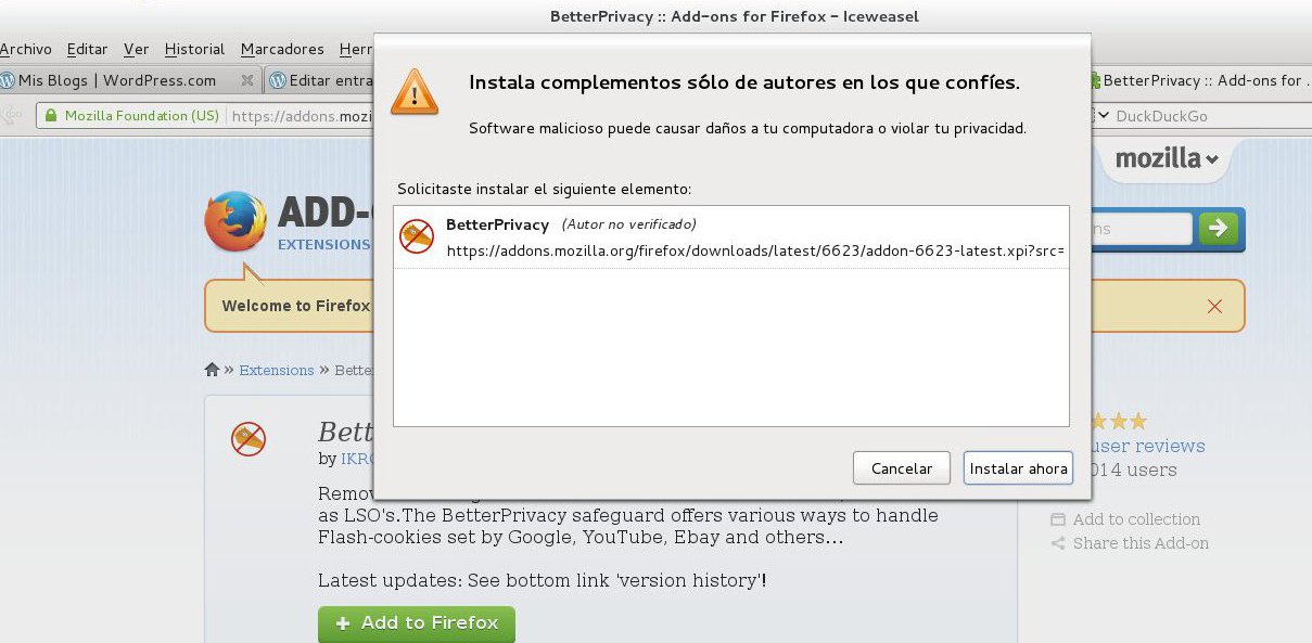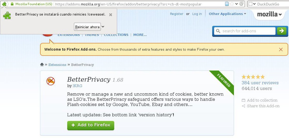 En este cuadro de diálogo hacemos click sobre el botón verde con la leyenda Add to Firefox y observamos el siguiente mensaje