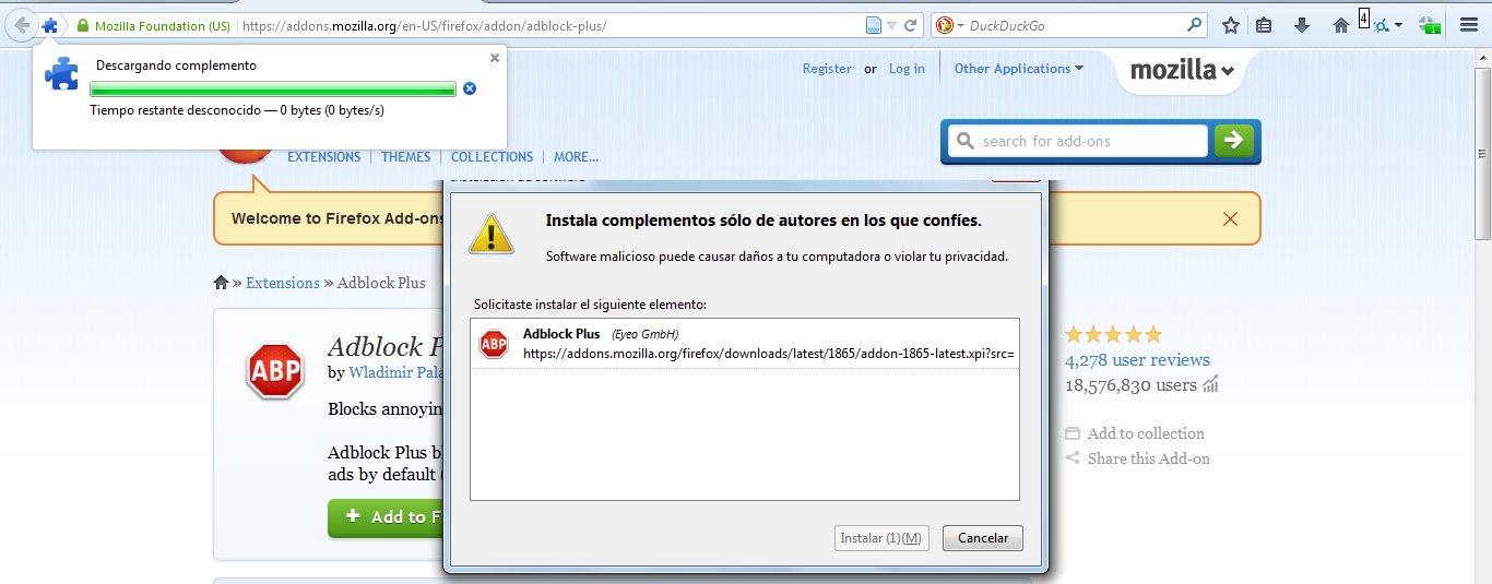 2. De manera similar, para agregar el segundo complemento hacemos click en Adblock Plus, con lo que bloquearemos banners, ventanas emergentes, anuncios de video y en general evitaremos publicidad intrusiva.