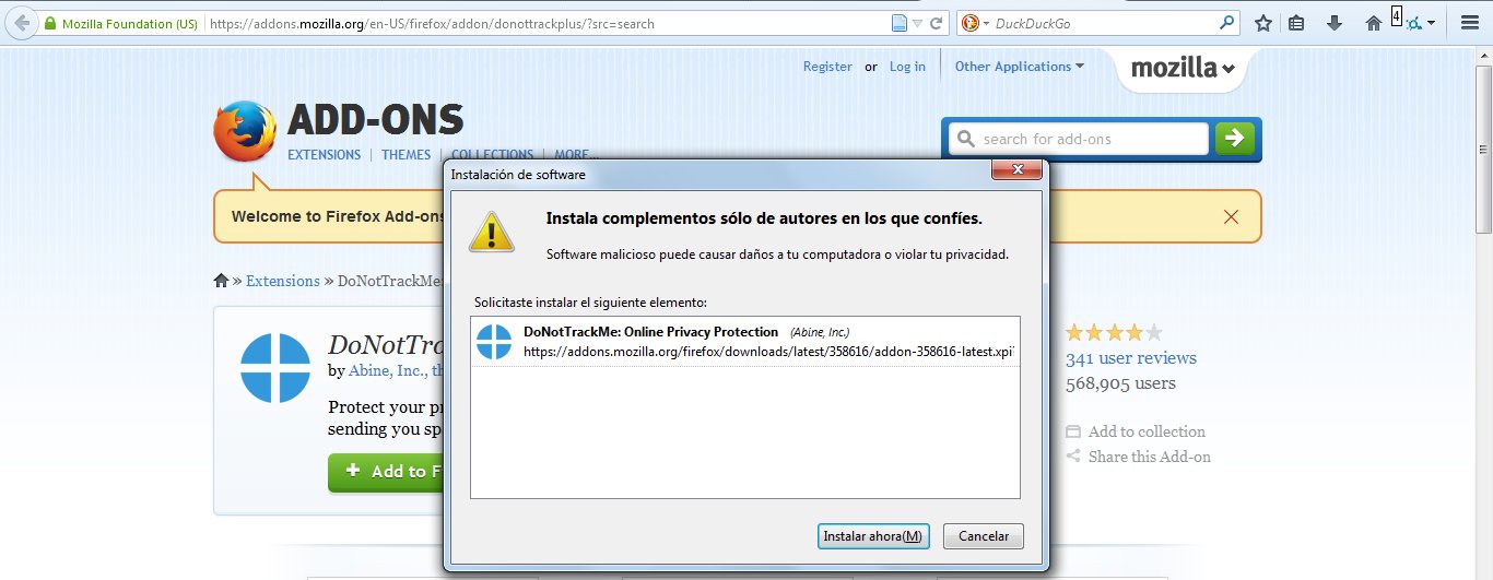 1. Para agregar el primer complemento hacemos click en DoNotTrackme, y nos lleva a la siguiente pantalla: